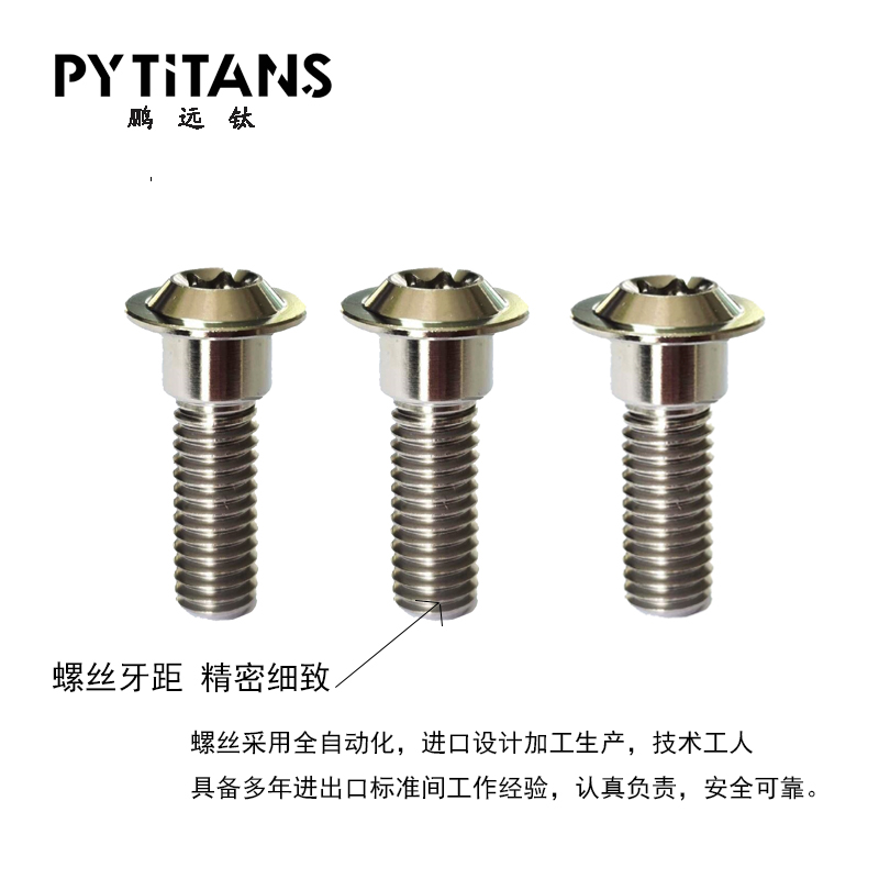 大多数人认为螺丝就是一颗螺丝,把它看为是一件连接物体的金属零件,仅此而已,紧固件(螺栓或者螺丝)从机械和冶金上说是个复杂的五金零件。它们有公制的,ASE标准的(美国机动车工程标准)和其他标准。用到不同的材料、不同的螺纹类型(粗牙、细牙)、各种长度、有光杆部分和全螺纹的、有不同的头型、以及不同的图层等。 PYTITANS公司是一家专业而出色的有色金属(GR.1.2.3.4.5.7.9.12)标准件和钛制品特别定制加工的企业,创建于2003年,2005年开始就通过了IS09001-2000认证,经过了10多年的经验积累,现在拥有自己的专利、商标的品牌。 PYTITANS Bolts (鹏远钛) 重量轻、性能高、超硬、超耐磨、超耐腐蚀、超防松,级别可以达到标准8.8级、10.9级以上。重量只有同等刚螺丝的57%。产品应用在自行车、摩托车、汽车、赛车、游艇、体育、电子、制药、石油、冶金、化工、海水淡化、海洋工程、建筑等行业!PYTITANS SuperTi Bolts 螺丝背后是靠专业的研发团队和先进的生产技术作为支撑,更重要的是我们对钛的热爱。