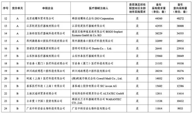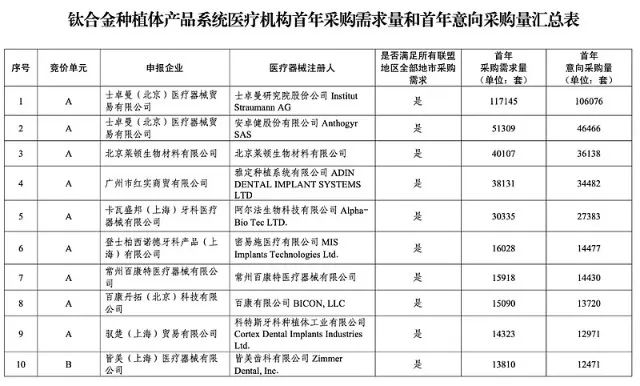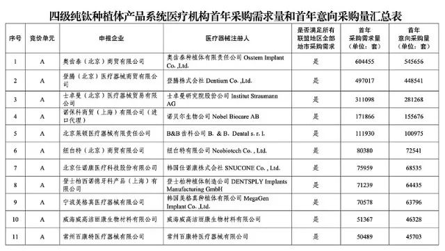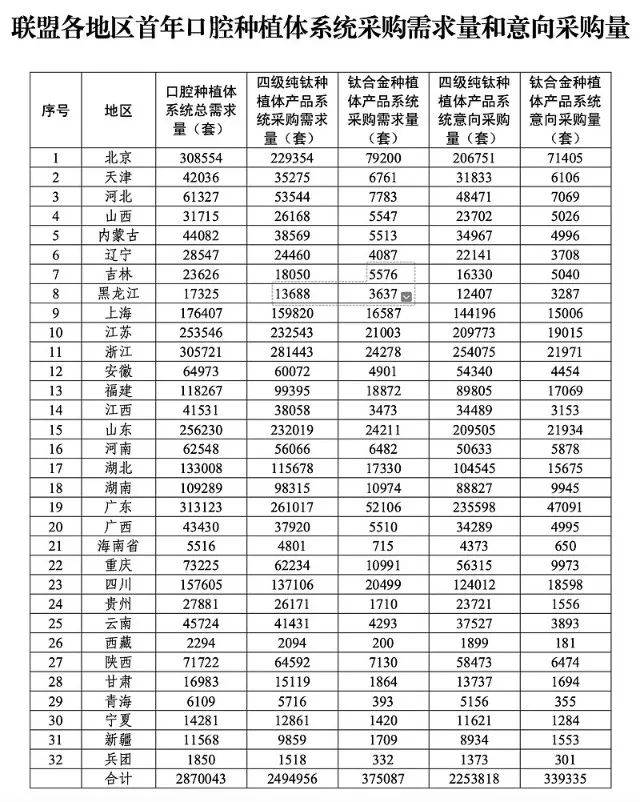 1.种植体(含覆盖螺丝,下同)是指植入到人体牙槽骨内,用于为义齿等修复体提供固定或支撑的医用耗材。本次集中带量采购种植体材质为四级纯钛或钛合金,不含临时种植体、穿颧种植体和一段式种植体。 2.本次集中带量采购修复基台为单牙种植修复基台,材质为纯钛或钛合金,其中螺丝固定的修复基台应包含中央螺丝。适用于多牙种植的复合基台暂不纳入。 3.配件包应包含愈合基台、转移杆、种植体替代体各1件,材质包含纯钛、钛合金、高分子材料等。各产品系统类别的首年意向采购量按参加本次集中带量采购的每一家医疗机构报送的各产品系统首年采购需求量的90%(如出现非整数则向上取整至个位)累加得出。其中,四级纯钛种植体产品系统首年采购需求量为2494956套,首年意向采购量为2253818套;钛合金种植体产品系统首年采购需求量为375087套,首年意向采购量为339335套。医疗机构首年采购需求量和首年意向采购量汇总见下表: